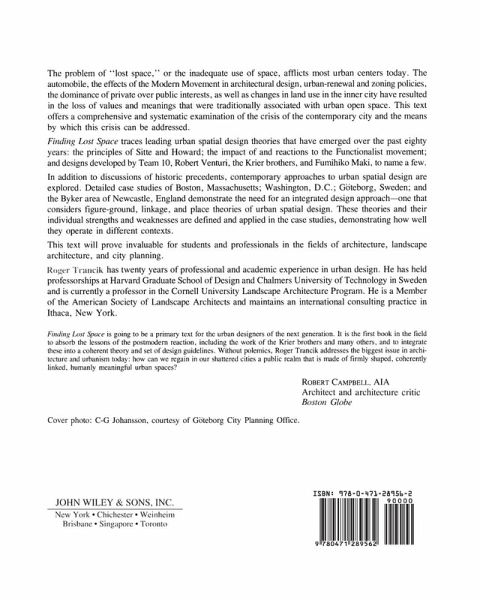 The problem of "lost space," or the inadequate use of space, afflicts most urban centers today. The automobile, the effects of the Modern Movement in architectural design, urban-renewal and zoning policies, the dominance of private over public interests, as well as changes in land use in the inner city have resulted in the loss of values and meanings that were traditionally associated with urban open space. This text offers a comprehensive and systematic examination of the crisis of the contemporary city and the means by which this crisis can be addressed. Finding Lost Space traces leading urban spatial design theories that have emerged over the past eighty years: the principles of Sitte and Howard; the impact of and reactions to the Functionalist movement; and designs developed by Team 10, Robert Venturi, the Krier brothers, and Fumihiko Maki, to name a few. In addition to discussions of historic precedents, contemporary approaches to urban spatial design are explored. Detailed case studies of Boston, Massachusetts; Washington, D.C.; Göteborg, Sweden; and the Byker area of Newcastle, England demonstrate the need for an integrated design approach--one that considers figure-ground, linkage, and place theories of urban spatial design. These theories and their individual strengths and weaknesses are defined and applied in the case studies, demonstrating how well they operate in different contexts. This text will prove invaluable for students and professionals in the fields of architecture, landscape architecture, and city planning. Finding Lost Space is going to be a primary text for the urban designers of the next generation. It is the first book in the field to absorb the lessons of the postmodern reaction, including the work of the Krier brothers and many others, and to integrate these into a coherent theory and set of design guidelines. Without polemics, Roger Trancik addresses the biggest issue in architecture and urbanism today: how can we regain in our shattered cities a public realm that is made of firmly shaped, coherently linked, humanly meaningful urban spaces? Robert Campbell, AIA Architect and architecture critic Boston Globe