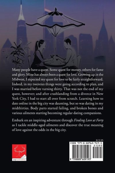 Many people have a quest. Some quest for money, others for fame and glory. Mine has always been a quest for love. Growing up in the Midwest, I expected my quest for love to be fairly straightforward. Indeed, in my twenties things were going according to plan, and I was married before turning thirty. That was not the end of my quest, however; and after crashlanding from a divorce in New York City, I had to start all over from scratch. Learning how to date online in the big city was daunting, but so was dating in my midthirties. Body parts started failing, and broken bones and various ailments starting becoming regular dating companions. Embark on an inspiring adventure through Finding Love at Forty as I tackle middle-aged ailments and discover the true meaning of love against the odds in the big city.
