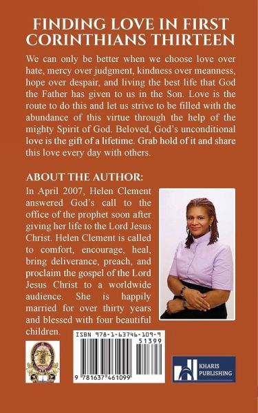 We can only be better when we choose love over hate, mercy over judgment, kindness over meanness, hope over despair, and living the best life that God the Father has given to us in the Son. Love is the route to do this and let us strive to be filled with the abundance of this virtue through the help of the mighty Spirit of God. Beloved, God's unconditional love is the gift of a lifetime. Grab hold of it and share this love every day with others. Endorsement:As believers, love is a compelling phenomenon in our walk and relationship with the Lord. As loaded as it is, the choice of love as a subject for this book makes it a must-read for everyone. The author systematically expounds upon the need to go beyond regarding love as a theoretical concept. She emphasizes the imperative for us to listen to our Lord's commandment. We must see love as an action word worthy of practice amongst ourselves in our daily lives in our homes, churches, workplaces, schools, market places, etc.%Pastor Tochi When we listen to the Lord's injunction, we are in obedience. When we listen not, we are in disobedience. The author dutifully points out God's immutable style of rewarding compliance and the inescapable consequences of disobedience. The word of God in Isaiah 1:19-20 anchors her point. "If you are willing and obedient, you shall eat the good of the land, but if you refuse and rebel, you shall be devoured by the sword for the mouth of the Lord hath spoken it."In agreement with the author, love, among many other factors, is the uniqueness of our oneness as God's creation.%Hans C. Reviews for 1Cor.13I loved the flow of this book, and you can sense that this book is Spirit-filled from the beginning to the end. The anointing is so powerful, and it is evident that the author is gifted. We need more Spirit-filled books and authors like this woman to give us God's perspective and not man's.%Regina C Let me start by saying that this is one of the best Christian books that I have read in a long time. I had to read it repeatedly to allow each verse to absorb in my spirit. God's love is assuring, and it is demonstrated in this book. There is no doubt that God is still speaking to us through His servants today.%Kaleb W More grace to this author and I am definitely a fan now because I can't wait to read more books written by her.%John E About the Author:In April 2007, Helen Clement answered God's call to the office of the prophet soon after giving her life to the Lord Jesus Christ. Helen Clement is called to comfort, encourage, heal, bring deliverance, preach, and proclaim the gospel of the Lord Jesus Christ to a worldwide audience. She is happily married for over thirty years and blessed with four beautiful children.