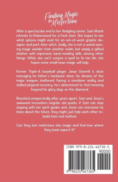 Finding Magic in Misfortune is a magical romantic comedy about second chances, self-discovery, and the undeniable nature of love. After a spectacular end to her fledgling career, Sam Marsh retreats to Emberwood for a fresh start. She hopes to see what options might exist for an out-of-work graphic designer and part-time witch. Sadly, she is not a wand-waving magic wielder from another realm, but simply a gifted intuitive with impressive tarot-reading skills, among other things. While she can't conjure a spell to fix her life, she hopes some small-town magic will help . Former Triple-A baseball player Jesse Garrett is stuck managing his father's hardware store, his dreams of the major leagues shattered. Facing a mundane reality and stalled physical recovery, he's determined to find meaning beyond his glory days on the diamond. Reunited unexpectedly after years apart, Sam and Jesse's awkward encounters reignite old sparks. If Sam can stop arguing with her spirit guides and Jesse can overcome his fears about the future, they might just help each other rebuild from rock bottom. Can they turn misfortune into magic and find love where they least expect it?