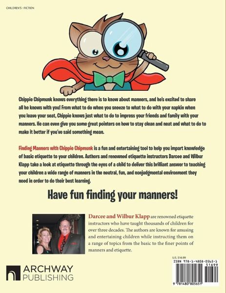Chippie Chipmunk knows everything there is to know about manners, and he's excited to share all he knows with you! From what to do when you sneeze to what to do with your napkin when you leave your seat, Chippie knows just what to do to impress your friends and family with your manners. He can even give you some great pointers on how to stay clean and neat and what to do to make it better if you've said something mean. Finding Manners with Chippie Chipmunk is a fun and entertaining tool to help you impart knowledge of basic etiquette to your children. Authors and renowned etiquette instructors Darcee and Wilbur Klapp take a look at etiquette through the eyes of a child to deliver this brilliant answer to teaching your children a wide range of manners in the neutral, fun, and nonjudgmental environment they need in order to do their best learning. Have fun finding your manners!