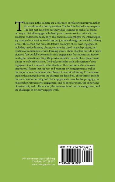 The essays in this volume are a collection of reflective narratives, rather than traditional scholarly treatises. The book is divided into two parts. The first part describes our individual journeys as each of us found our way to civically engaged scholarship and came to see it as critical to our academic endeavors and identity. This section also highlights the interdisciplinary nature of our work as we discuss our journeys through our own disciplinary lenses. The second part presents detailed examples of our civic engagement, including service-learning classes, communitybased research projects, and creation of community service-learning spaces. These chapters provide a varied picture of the available avenues for civic engagement for students and faculty in a higher education setting. We provide sufficient details of our projects and classes to enable replication. The book concludes with a discussion of civic engagement as it is defined in the literature. The conclusion also discusses institutional factors that support and promote civic engagement as well as the importance of community involvement in service learning. Five common themes that emerged across the chapters are described. These themes include the use of service learning and civic engagement as an effective pedagogy, the relationship between civic engagement and political activism, the importance of partnership and collaboration, the meaning found in civic engagement, and the challenges of civically engaged work.