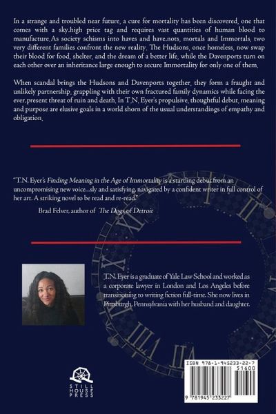 In a strange and troubled near future, a cure for mortality has been discovered, one that comes with a sky-high price tag and requires vast quantities of human blood to manufacture. As society schisms into have-nots and haves, mortals and Immortals, two very different families confront the new reality. The Hudsons, once homeless, now swap their blood for food, shelter, and the dream of a better life, while the Davenports turn on each other over an inheritance large enough to secure Immortality for only one of them. When scandal brings the Hudsons and Davenports together, they form a fraught and unlikely partnership, grappling with their own fractured family dynamics while facing the ever-present threat of ruin and death. In T.N. Eyer's propulsive, thoughtful debut, meaning and purpose are elusive goals in a world shorn of the usual understandings of empathy and obligation.