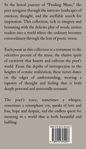 In the lyrical journey of "Finding Muse," the poet navigates through the intricate landscapes of emotion, thought, and the ineffable search for inspiration. This collection, rich in imagery and brimming with the delicate play of words, invites readers into a world where the ordinary becomes extraordinary through the lens of poetic vision.Each poem in this collection is a testament to the relentless pursuit of the muse, the elusive spirit of creativity that haunts and enlivens the poet's world. From the depths of introspection to the heights of ecstatic realization, these verses dance on the edges of understanding, weaving a tapestry of thought and feeling that is both deeply personal and universally resonant.The poet's voice, sometimes a whisper, sometimes a triumphant cry, speaks of love and loss, hope and despair, and the endless quest for meaning in a world that is both beautiful and baffling. Copyright © 2023 Book Fairy Publishing