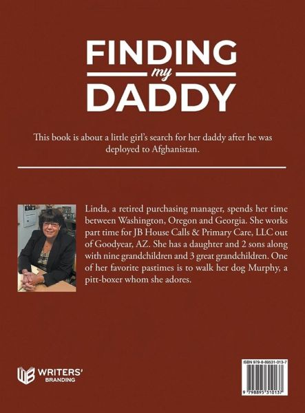 Synopsis: This book is about a little girl's search for her daddy after he was deployed to Afghanistan. Autobiography: Linda, a retired purchasing manager, spends her time between Washington, Oregon and Georgia. She works part time for JB House Calls & Primary Care, LLC out of Goodyear, AZ. She has a daughter and 2 sons along with nine grandchildren and 3 great grandchildren. One of her favorite pastimes is to walk her dog Murphy, a pitt-boxer whom she adores.