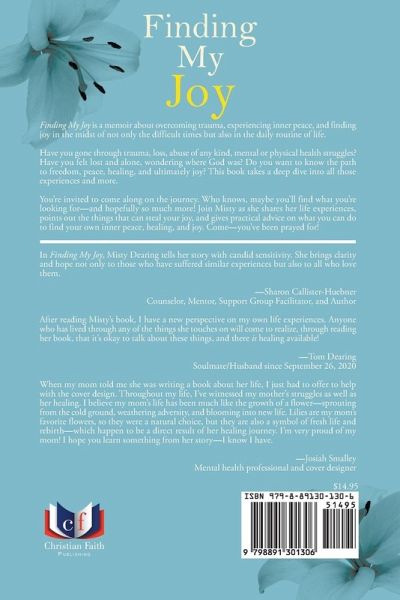 Finding My Joy is a memoir about overcoming trauma, experiencing inner peace, and finding joy in the midst of not only the difficult times but also in the daily routine of life. Have you gone through trauma, loss, abuse of any kind, mental or physical health struggles? Have you felt lost and alone, wondering where God was? Do you want to know the path to freedom, peace, healing, and ultimately joy? This book takes a deep dive into all those experiences and more. You're invited to come along on the journey. Who knows, maybe you'll find what you're looking for--and hopefully so much more! Join Misty as she shares her life experiences, points out the things that can steal your joy, and gives practical advice on what you can do to find your own inner peace, healing, and joy. Come--you've been prayed for! In Finding My Joy, Misty Dearing tells her story with candid sensitivity. She brings clarity and hope not only to those who have suffered similar experiences but also to all who love them. --Sharon Callister-Huebner Counselor, Mentor, Support Group Facilitator, and Author After reading Misty's book, I have a new perspective on my own life experiences. Anyone who has lived through any of the things she touches on will come to realize, through reading her book, that it's okay to talk about these things, and there is healing available! --Tom Dearing Soulmate/Husband since September 26, 2020 When my mom told me she was writing a book about her life, I just had to offer to help with the cover design. Throughout my life, I've witnessed my mother's struggles as well as her healing. I believe my mom's life has been much like the growth of a flower--sprouting from the cold ground, weathering adversity, and blooming into new life. Lilies are my mom's favorite flowers, so they were a natural choice, but they are also a symbol of fresh life and rebirth--which happen to be a direct result of her healing journey. I'm very proud of my mom! I hope you learn something from her story--I know I have. --Josiah Smalley Mental health professional and cover designer