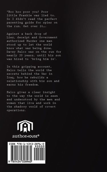 "Boo hoo poor you! Poor little Frankie was lied to. So I didn't read the perfect parenting guide for spies on the run. Get over it.. Against a back drop of Lies, deceit and Government authorised Murder one man stood up to let the world know what was being done. Davey Falco was on the run for nearly 20 years, until his son was hired to 'bring him in'. In this gripping account, Falco tells the world the secrets behind the War in Iraq, how he rebuilds a relationship with his son and earns his freedom. Falco gives a clear insight to the way the world is seen and understood by the men and women that live and work in the shadowy world of covert operations.