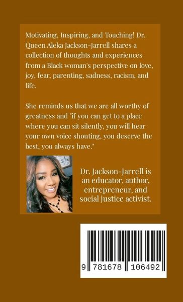 Motivating, Inspiring, and Touching! Dr. Queen Aleka Jackson-Jarrell shares a collection of thoughts and experiences from a Black woman's perspective on love, joy, fear, parenting, sadness, racism, and life. She reminds us that we are all worthy of greatness and that "if you can get to a place where you can sit silently, you will hear your own voice shouting, you deserve the best, you always have."