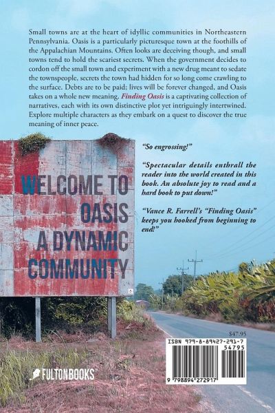 Small towns are at the heart of idyllic communities in Northeastern Pennsylvania. Oasis is a particularly picturesque town at the foothills of the Appalachian Mountains. Often looks are deceiving though, and small towns tend to hold the scariest secrets. When the government decides to cordon off the small town and experiment with a new drug meant to sedate the townspeople, secrets the town had hidden for so long come crawling to the surface. Debts are to be paid; lives will be forever changed, and Oasis takes on a whole new meaning. Finding Oasis is a captivating collection of narratives, each with its own distinctive plot yet intriguingly intertwined. Explore multiple characters as they embark on a quest to discover the true meaning of inner peace.