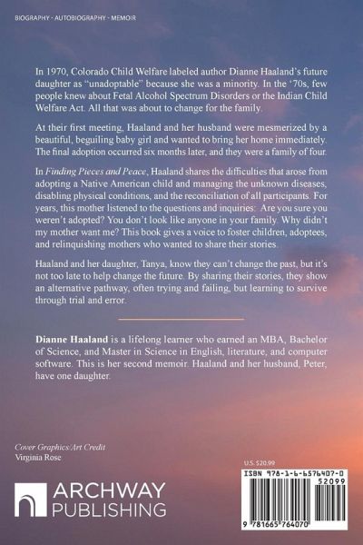 In 1970, Colorado Child Welfare labeled author Dianne Haaland's future daughter as "unadoptable" because she was a minority. In the '70s, few people knew about Fetal Alcohol Spectrum Disorders or the Indian Child Welfare Act. All that was about to change for the family. At their first meeting, Haaland and her husband were mesmerized by a beautiful, beguiling baby girl and wanted to bring her home immediately. The final adoption occurred six months later, and they were a family of four. In Finding Pieces and Peace, Haaland shares the difficulties that arose from adopting a Native American child and managing the unknown diseases, disabling physical conditions, and the reconciliation of all participants. For years, this mother listened to the questions and inquiries: Are you sure you weren't adopted? You don't look like anyone in your family. Why didn't my mother want me? This book gives a voice to foster children, adoptees, and relinquishing mothers who wanted to share their stories. Haaland and her daughter, Tanya, know they can't change the past, but it's not too late to help change the future. By sharing their stories, they show an alternative pathway, often trying and failing, but learning to survive through trial and error.
