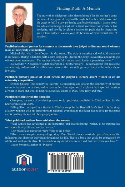 Finding Ruth is the memoir of a young boy cajoled into a profession for which he has no desire. He hates medical school and chooses pediatrics as the most interesting of bad choices. He uses his love for baseball to interact with a terminally ill eleven year old. The boy teaches the fledgling physician about compassion and the need to listen to the hopes and dreams of patients even though they are children. A passion for pediatrics is born. The memoir also deals with an adolescent trying to forgive himself for thinking he caused his mother's death because of an argument they had the night before her fatal stroke. He vows to fulfill his mother's dream of one day visiting Israel. He forgets the vow, but is reminded of it by the anti-Semitism he experiences along the way. Despite a busy practice, he fulfills the vow, and learns that he lost an eleven year old cousin in the Holocaust. Previously, he thought his family had been immune from Nazi atrocities. As the memoir ends, his son is the same age as his dead cousin. The boy is standing in front of a glass column in Yad Vashem in Jerusalem. It contains a baby's booty .He is mouthing in disbelief the inscription which represents the number of children lost in the Holocaust, "Children, one and a half million. Children, one and a half million."