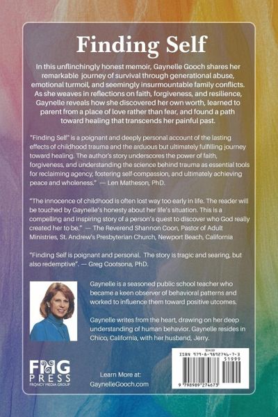 In her powerful debut autobiography, Gaynelle Gooch recounts her life's journey in Finding her Self.As an adult, Gaynelle was challenged with the ramifications from her childhood experiences. She wanted answers. She searched for clues and information that would help relieve her emotional suffering. In describing her unusual childhood and life-long journey toward recovery, we see how each new insight led to another. Incrementally, Gaynelle came to understand and accept the realities of what had happened to her. Healing seeped in. She found comfort, love, and guidance through the Christian faith; nevertheless, she found forgiveness beyond her reach.This bold account of Gaynelle's story validates the power of character development and God's presence in her life.