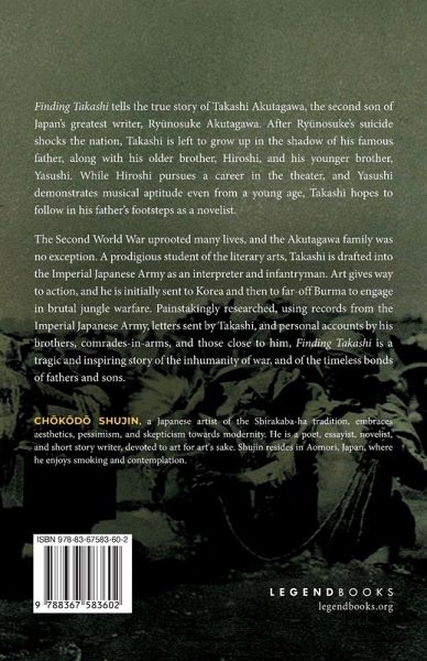 Finding Takashi tells the true story of Takashi Akutagawa, the second son of Japan's greatest writer, Ry¿nosuke Akutagawa. After Ry¿nosuke's suicide shocks the nation, Takashi is left to grow up in the shadow of his famous father, along with his older brother, Hiroshi, and his younger brother, Yasushi. While Hiroshi pursues a career in the theater, and Yasushi demonstrates musical aptitude even from a young age, Takashi hopes to follow in his father's footsteps as a novelist. The Second World War uprooted many lives, and the Akutagawa family was no exception. A prodigious student of the literary arts, Takashi is drafted into the Imperial Japanese Army as an interpreter and infantryman. Art gives way to action, and he is initially sent to Korea and then to far-off Burma to engage in brutal jungle warfare. Painstakingly researched, using records from the Imperial Japanese Army, letters sent by Takashi, and personal accounts by his brothers, comrades-in-arms, and those close to him, Finding Takashi is a tragic and inspiring story of the inhumanity of war, and of the timeless bonds of fathers and sons.