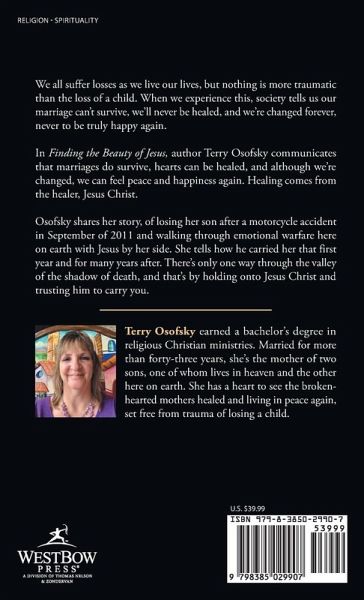 We all suffer losses as we live our lives, but nothing is more traumatic than the loss of a child. When we experience this, society tells us our marriage can't survive, we'll never be healed, and we're changed forever, never to be truly happy again. In Finding the Beauty of Jesus, author Terry Osofsky communicates that marriages do survive, hearts can be healed, and although we're changed, we can feel peace and happiness again. Healing comes from the healer, Jesus Christ. Osofsky shares her story, of losing her son after a motorcycle accident in September of 2011 and walking through emotional warfare here on earth with Jesus by her side. She tells how he carried her that first year and for many years after. There's only one way through the valley of the shadow of death, and that's by holding onto Jesus Christ and trusting him to carry you.