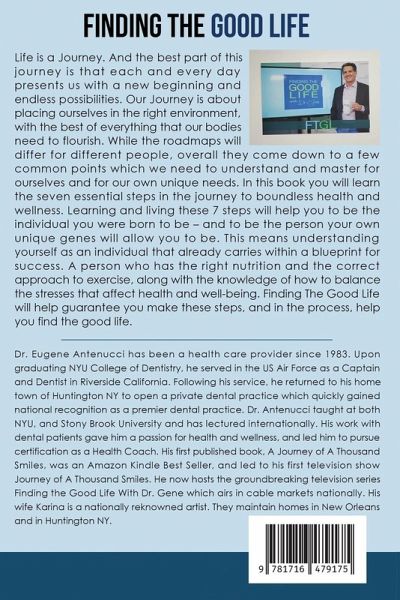 Finding The Good Life is a guidebook to achieving complete Health and Wellness. While fitness and nutrition are keys to health, this book lays a foundation for achieving the highest levels of wellness by providing a path that begins with self-awareness and discovery. People can only become their best possible selves when they understand where they came from genetically, where they are in terms of health and fitness today, and set a firm direction for the future by learning to set realistic and concrete goals. The process of setting goals is dealt with in detail - goals for fitness, for weight loss and control, for nutrition and all else in life, in order to provide a roadmap for success. Dr. Antenucci goes into detail on proper nutrition, providing a ground-level understanding of the what proper nutrition means. The correct balance of protein, fat, carbohydrates, minerals and nutrients are laid out in a way that is easy to understand and incorporate, and a sample menu of balanced eating is provided. Exercise and fitness are presented so that there is a full understanding of how to approach exercise related to personal fitness goals as well as for optimum health. Dr. Antenucci closes with the need for balance in all aspects of life in order to achieve the highest levels of health and well-being. Finding the Good Life is a roadmap to achieving health and wellness through exercise fitness and nutrition based on sound principles of self- knowledge and balance in every-day life.