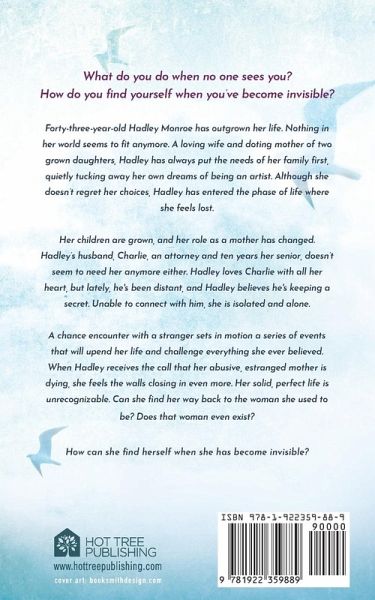 What do you do when no one sees you? How do you find yourself when you've become invisible? Forty-three-year-old Hadley Monroe has outgrown her life. Nothing in her world seems to fit anymore. A loving wife and doting mother of two grown daughters, Hadley has always put the needs of her family first, quietly tucking away her own dreams of being an artist. Although she doesn't regret her choices, Hadley has entered the phase of life where she feels lost. Her children are grown, and her role as a mother has changed. Hadley's husband, Charlie, an attorney and ten years her senior, doesn't seem to need her anymore either. Hadley loves Charlie with all her heart, but lately, he's been distant, and Hadley believes he's keeping a secret. Unable to connect with him, she is isolated and alone. A chance encounter with a stranger sets in motion a series of events that will upend her life and challenge everything she ever believed. When Hadley receives the call that her abusive, estranged mother is dying, she feels the walls closing in even more. Her solid, perfect life is unrecognizable. Can she find her way back to the woman she used to be? Does that woman even exist? How can she find herself when she has become invisible?