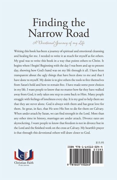 Writing this book has been a journey of spiritual and emotional cleansing and healing for me. I needed to write it as much for myself as for others. My goal was to write this book in a way that points others to Christ. It begins where I begin! Beginning with the day I was born and up to present day, showing how God's hand was on my life through it all. I have been transparent about the ugly things that have been done to me and that I have done to myself. My desire is to give others the tools to free themselves from Satan's hold and how to remain free. I have made some poor choices in my life. I want people to know that no matter how far they have walked away from God, it only takes one step to come back to Him. Many people struggle with feelings of loneliness every day. It is my goal to help them see that they are never alone. God is always with them and has great love for them. So great, in fact, that He sent His Son to die for them on Calvary. When under attack by Satan, we can find strength in the Lord. More than any other time in history, marriages are under attack. Divorce rates are skyrocketing. I want people to know that freedom is not in divorce but in the Lord and the finished work on the cross at Calvary. My heartfelt prayer is that through this devotional others will draw closer to God.
