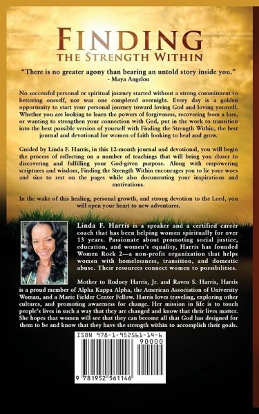 No successful personal or spiritual journey started without a strong commitment to bettering oneself, nor was one completed overnight. Every day is a golden opportunity to start your personal journey toward loving God and loving yourself. Whether you are looking to learn the powers of forgiveness, recovering from a loss, or wanting to strengthen your connection with God, put in the work to transition into the best possible version of yourself with Finding the Strength Within, the best journal and devotional for women of faith looking to heal and grow. Guided by Linda F. Harris, in this 12-month journal and devotional, you will begin the process of reflecting on a number of teachings that will bring you closer to discovering and fulfilling your God-given purpose. Along with empowering scriptures and wisdom, Finding the Strength Within encourages you to lie your woes and sins to rest on the pages while also documenting your inspirations and motivations. In the wake of this healing, personal growth, and strong devotion to the Lord, you will open your heart to new adventures.