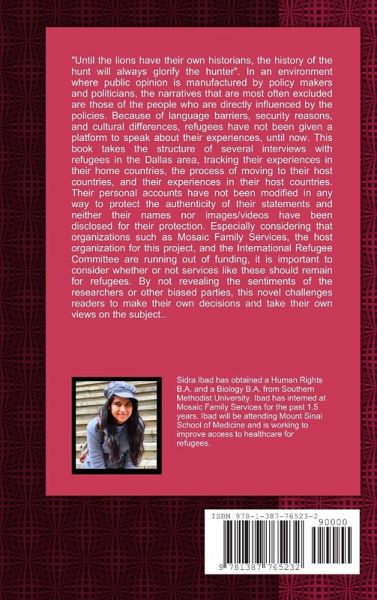 "Until the lions have their own historians, the history of the hunt will always glorify the hunter". In an environment where public opinion is manufactured by policy makers and politicians, the narratives that are most often excluded are those of the people who are directly influenced by the policies. Because of language barriers, security reasons, and cultural differences, refugees have not been given a platform to speak about their experiences, until now. This book tracks their experiences in their home countries, the process of moving to their host countries, and their experiences in their host countries. Their personal accounts have not been modified in any way to protect the authenticity of their statements and neither their names nor images/videos have been disclosed for their protection. Especially considering that organizations such as Mosaic Family Services and the IRC are running out of funding, it is important to consider whether or not services like these should remain for refugees.