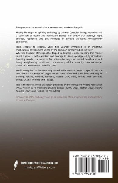Being exposed to a multicultural environment awakens the spirit. Finding The Way-an uplifting anthology by thirteen Canadian immigrant writers-is a collection of fiction and non-fiction stories and poetry that portrays hope, courage, resilience, and grit rekindled in difficult situations. Unexpectedly sometimes. From chapter to chapter, you'll find yourself immersed in an insightful, multicultural environment united by the common thread "finding the way." Whether it's about life's signs that forged trailblazers ... understanding that "home" is not a place ... self-realization and courage to stand up triggered by Grandma's haunting words ... a quest to find alternative ways for mental health and well-being... enlightening transitions ... or a wake-up call for humanity, there are deeper universal themes woven into this book. You'll recognize or become acquainted with cultural aspects specific to the contributors' countries of origin, which have influenced their lives and way of thinking: Ghana, Ukraine, Romania, Russia, USA, India, United Arab Emirates, Senegal, Cuba, Trinidad and Tobago. This is the fourth annual anthology published by the Immigrant Writers Association (IWA), written by its members. After publishing Building Bridges (2019), Grow Together (2020) and Moving Forward (2021), IWA hopes that Finding The Way anthology will inspire you to start or persist in your own quest. Ready to read this anthology? You are one step away! All proceeds from the anthology sales go to supporting IWA's programming and its next anthologies.