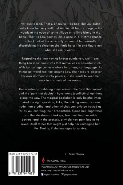Her auntie died. That's, of course, too bad. But Lou didn't really know her very well and Auntie left her a cottage in the woods at the edge of some village on a little island in the Baltic. That, to Lou, sounds like a once-in-a-lifetime chance to back out of the outwardly successful but inwardly dissatisfying life situation she finds herself in and figure out what she really wants. Regarding the "not having known auntie very well": one thing Lou didn't know was that auntie was a powerful witch. With her cottage comes a whole lot of magical baggage. As things get weird real fast around Lou, she needs to discover her own dormant witchy powers, if she wants to keep her neck in this neck of the woods. Her constantly quibbling inner voices - the 'part that knows' and the 'part that doubts' - have many (conflicting) opinions along the way. The magical bookshelf is only helpful when asked the right question, Luke, the talking raven, is more rude than erudite, and other witches can only be trusted as far as you can fling their broomsticks. Come hell, highwater or a thunderstorm of turkeys, Lou must find her witch powers, and in the process, a whole new path begins to reveal itself to her that might just help her reimagine her life. That is, if she manages to survive.