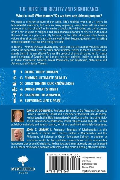 We need a coherent picture of our world. Life’s realities won’t let us ignore its fundamental questions, but with so many opposing views, how will we choose answers that are reliable? In this series of books, David Gooding and John Lennox offer a fair analysis of religious and philosophical attempts to find the truth about the world and our place in it. By listening to the Bible alongside other leading voices, they show that it is not only answering life’s biggest questions—it is asking better questions than we ever thought to ask. In Book 2 – Finding Ultimate Reality, they remind us that the authority behind ethics cannot be separated from the truth about ultimate reality. Is there a Creator who stands behind his moral law? Are we the product of amoral forces, left to create moral consensus? Gooding and Lennox compare ultimate reality as understood in: Indian Pantheistic Monism, Greek Philosophy and Mysticism, Naturalism and Atheism, and Christian Theism.