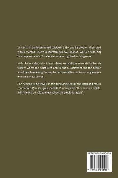 Vincent van Gogh committed suicide in 1890, and his brother, Theo, died soon thereafter. His widow, Johanna, was left with many paintings and the desire for Vincent's recognition. In this historical novel, Johanna hires Armand Roulin, painted by Vincent in Arles, to research the artists and villages of France where Vincent lived. Along the way he becomes attracted to a young woman in Auvers, also painted by Vincent. Join Armand as he travels in the steps of Vincent and meets Dr. Gachet, Paul Gauguin, Camille Pissaro, and other renown artists who worked with Vincent.
