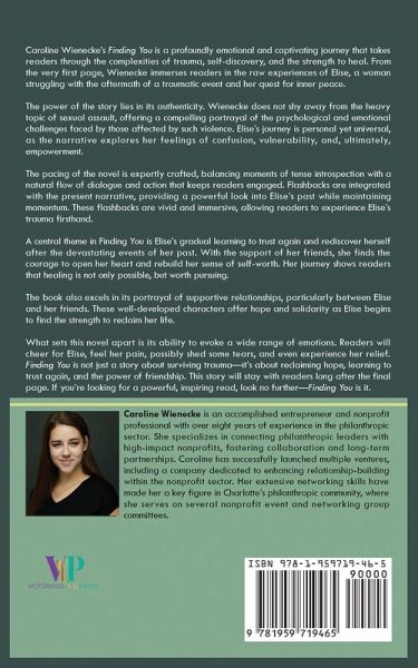 Caroline Wienecke's Finding You is a profoundly emotional and captivating journey that takes readers through the complexities of trauma, self-discovery, and the strength to heal. From the very first page, Wienecke immerses readers in the raw experiences of Elise, a woman struggling with the aftermath of a traumatic event and her quest for inner peace. The power of the story lies in its authenticity. Wienecke does not shy away from the heavy topic of sexual assault, offering a compelling portrayal of the psychological and emotional challenges faced by those affected by such violence. Elise's journey is personal yet universal, as the narrative explores her feelings of confusion, vulnerability, and, ultimately, empowerment. The pacing of the novel is expertly crafted, balancing moments of tense introspection with a natural flow of dialogue and action that keeps readers engaged. Flashbacks are integrated with the present narrative, providing a powerful look into Elise's past while maintaining momentum. These flashbacks are vivid and immersive, allowing readers to experience Elise's trauma firsthand. A central theme in Finding You is Elise's gradual learning to trust again and rediscover herself after the devastating events of her past. With the support of her friends, she finds the courage to open her heart and rebuild her sense of self-worth. Her journey shows readers that healing is not only possible but worth pursuing. The book also excels in its portrayal of supportive relationships, particularly between Elise and her friends. These well-developed characters offer hope and solidarity as Elise begins to find the strength to reclaim her life. What sets this novel apart is its ability to evoke a wide range of emotions. Readers will cheer for Elise, feel her pain, possibly shed some tears, and even experience her relief. Finding You is not just a story about surviving trauma-it's about reclaiming hope, learning to trust again, and the power of friendship. This story will stay with readers long after the final page. If you're looking for a powerful, inspiring read, look no further-Finding You is it.