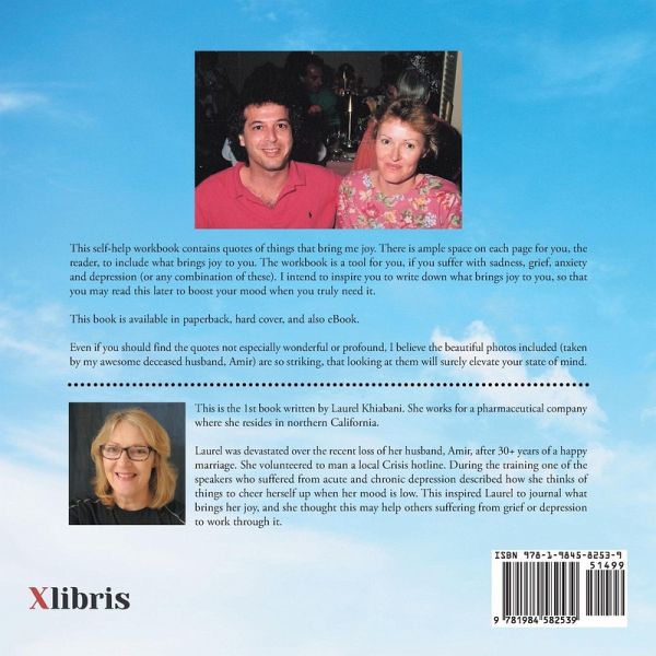 This self-help workbook contains quotes of things that bring me joy. There is ample space on each page for you, the reader, to include what brings joy to you. The workbook is a tool for you, if you suffer with sadness, grief, anxiety and depression (or any combination of these). I intend to inspire you to write down what brings joy to you, so that you may read this later to boost your mood when you truly need it. This book is available in paperback, hard cover, and also eBook. Even if you should find the quotes not especially wonderful or profound, I believe the beautiful photos included (taken by my awesome deceased husband, Amir) are so striking, that looking at them will surely elevate your state of mind.