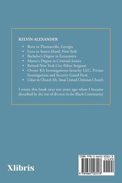 Kelvin Alexander - Born in Thomasville, Georgia - Lives in Staten Island, New York - Bachelor's Degree in Economics - Master's Degree in Criminal Justice - Retired New York City Police Sergeant - Owner KA Investigations-Security LLC, Private Investigations and Security Guard Firm - Usher in Church Mt. Sinai United Christian Church I wrote this book over ten years ago when I became disturbed by the rise of divorce in the Black Community