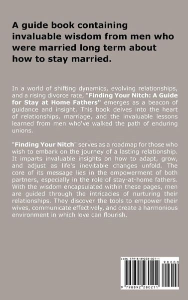 A guide book containing invaluable wisdom from men who were married long term about how to stay married. In a world of shifting dynamics, evolving relationships, and a rising divorce rate, "Finding Your Nitch: A Guide for Stay at Home Fathers" emerges as a beacon of guidance and insight. This book delves into the heart of relationships, marriage, and the invaluable lessons learned from men who've walked the path of enduring unions. "Finding Your Nitch" serves as a roadmap for those who wish to embark on the journey of a lasting relationship. It imparts invaluable insights on how to adapt, grow, and adjust as life's inevitable changes unfold. The core of its message lies in the empowerment of both partners, especially in the role of stay-at-home fathers. With the wisdom encapsulated within these pages, men are guided through the intricacies of nurturing their relationships. They discover the tools to empower their wives, communicate effectively, and create a harmonious environment in which love can flourish.