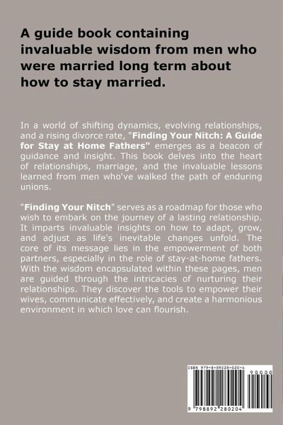A guide book containing invaluable wisdom from men who were married long term about how to stay married. In a world of shifting dynamics, evolving relationships, and a rising divorce rate, "Finding Your Nitch: A Guide for Stay at Home Fathers" emerges as a beacon of guidance and insight. This book delves into the heart of relationships, marriage, and the invaluable lessons learned from men who've walked the path of enduring unions. "Finding Your Nitch" serves as a roadmap for those who wish to embark on the journey of a lasting relationship. It imparts invaluable insights on how to adapt, grow, and adjust as life's inevitable changes unfold. The core of its message lies in the empowerment of both partners, especially in the role of stay-at-home fathers. With the wisdom encapsulated within these pages, men are guided through the intricacies of nurturing their relationships. They discover the tools to empower their wives, communicate effectively, and create a harmonious environment in which love can flourish.
