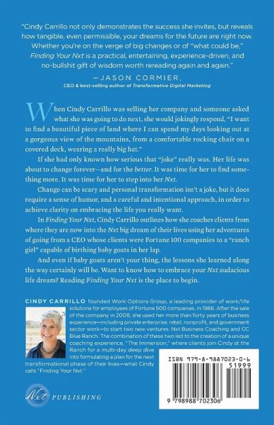 "Cindy Carrillo not only demonstrates the success she invites, but reveals how tangible, even permissible, your dreams for the future are right now. Whether you're on the verge of big changes or of "what could be," Finding Your Nxt is a practical, entertaining, experience¿driven, and nöbullshit gift of wisdom worth rereading again and again."-JASON CORMIER, CEO & best-selling author of Transformative Digital Marketing When Cindy Carrillo was selling her company and someone asked what she was going to do next, she would jokingly respond, "I want to find a beautiful piece of land where I can spend my days looking out at a gorgeous view of the mountains, from a comfortable rocking chair on a covered deck, wearing a really big hat." If she had only known how serious that "joke" really was. Her life was about to change forever-and for the better. It was time for her to find something more. It was time for her to step into her Nxt. Change can be scary and personal transformation isn't a joke, but it does require a sense of humor, and a careful and intentional approach, in order to achieve clarity on embracing the life you really want. In Finding Your Nxt, Cindy Carrillo outlines how she coaches clients from where they are now into the Nxt big dream of their lives using her adventures of going from a CEO whose clients were Fortune 100 companies to a "ranch girl" capable of birthing baby goats in her lap. And even if baby goats aren't your thing, the lessons she learned along the way certainly will be. Want to know how to embrace your Nxt audacious life dream? Reading Finding Your Nxt is the place to begin.