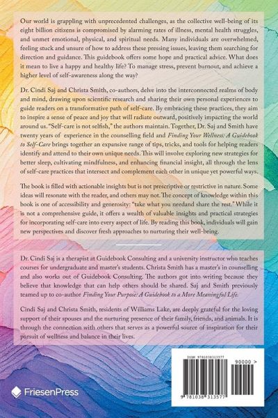 Our world is grappling with unprecedented challenges, as the collective well-being of its eight billion citizens is compromised by alarming rates of illness, mental health struggles, and unmet emotional, physical, and spiritual needs. Many individuals are overwhelmed, feeling stuck and unsure of how to address these pressing issues, leaving them searching for direction and guidance. This guidebook offers some hope and practical advice. What does it mean to live a happy and healthy life? To manage stress, prevent burnout, and achieve a higher level of self-awareness along the way? Dr. Cindi Saj and Christa Smith, co-authors, delve into the interconnected realms of body and mind, drawing upon scientific research and sharing their own personal experiences to guide readers on a transformative path of self-care. By embracing these practices, they aim to inspire a sense of peace and joy that will radiate outward, positively impacting the world around us. "Self-care is not selfish," the authors maintain. Together, Dr. Saj and Smith have twenty years of experience in the counselling field and Finding Your Wellness: A Guidebook to Self-Care brings together an expansive range of tips, tricks, and tools for helping readers identify and attend to their own unique needs. This will involve exploring new strategies for better sleep, cultivating mindfulness, and enhancing financial insight, all through the lens of self-care practices that intersect and complement each other in unique yet powerful ways. The book is filled with actionable insights but is not prescriptive or restrictive in nature. Some ideas will resonate with the reader, and others may not. The concept of knowledge within this book is one of accessibility and generosity: "take what you need and share the rest". While it is not a comprehensive guide, it offers a wealth of valuable insights and practical strategies for incorporating self-care into every aspect of life. By reading this book, individuals will gain new perspectives and discover fresh approaches to nurturing their well-being.