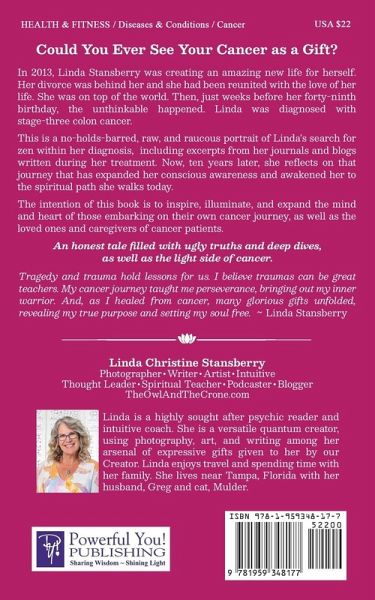 Could you ever see your cancer as a gift? Linda was reunited with the love of her life. Her divorce was behind her and she was creating a new and healthy life for herself. She was on top of the world. Then in 2013, just weeks before her 49th birthday, the unthinkable happened. Linda was diagnosed with stage three colon cancer. This memoir is a look back on Linda's cancer journey a decade after her diagnosis. The intention of this book is to inspire, illuminate, and expand the minds and hearts of those embarking on their own cancer journey, as well as loved ones and caretakers of cancer patients. This is a no-holds-barred, raw, and raucous portrait of Linda's search for her zen within her diagnosis. She journaled her way through cancer treatment in 2013. And now, ten years later, she reflects on that journey that has expanded her conscious awareness and awakened her to the spiritual journey she is on today. If you're willing to embrace an honest depiction of the ugly truths and the deep dives, along with the lighter side of cancer treatment that led to Linda's heart-centered, spiritual revelations that she uncovered within the journey, then this book is for you! Several years ago, Linda left her corporate television career to fulfill her dream of becoming a small business owner, running a successful photography studio, Linda Stansberry Photography.