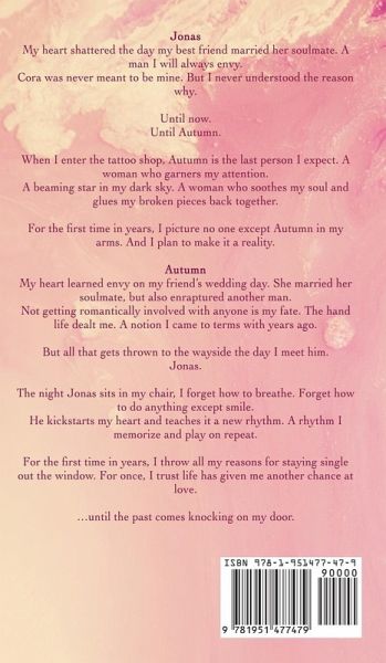 Love is never easy. Especially when three hearts are involved. Jonas My heart shattered the day my best friend married her soulmate. A man I will always envy. Cora was never meant to be mine. But I never understood the reason why. Until now. Until Autumn. When I enter the tattoo shop, Autumn is the last person I expect. A woman who garners my attention. A beaming star in my dark sky. A woman who soothes my soul and glues my broken pieces back together. For the first time in years, I picture no one except Autumn in my arms. And I plan to make it a reality. Autumn My heart learned envy on my friend's wedding day. She married her soulmate, but also enraptured another man. Not getting romantically involved with anyone is my fate. The hand life dealt me. A notion I came to terms with years ago. But all that gets thrown to the wayside the day I meet him. Jonas. The night Jonas sits in my chair, I forget how to breathe. Forget how to do anything except smile. He kickstarts my heart and teaches it a new rhythm. A rhythm I memorize and play on repeat. For the first time in years, I throw all my reasons for staying single out the window. For once, I trust life has given me another chance at love. ...until the past comes knocking on my door.