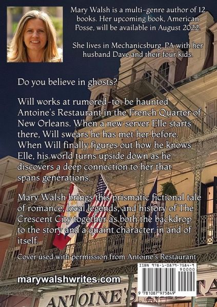 Do you believe in ghosts? Will works at rumored-to-be haunted Antoine's Restaurant in the French Quarter of New Orleans. When a new server Elle starts there, Will swears he has met her before. When Will finally figures out how he knows Elle, his world turns upside down as he discovers a deep connection to her that spans generations. Mary Walsh brings this prismatic fictional tale of romance, local legends, and history of The Crescent City together as both the backdrop to the story and a quaint character in and of itself. Cover photo taken by the author's brother, Patrick Walsh, and used with permission from Antoine's Restaurant.