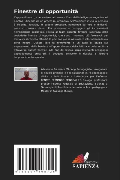 L'apprendimento, che avviene attraverso l'uso dell'intelligenza cognitiva ed emotiva, dipende da un processo interattivo nell'ambiente in cui la persona è inserita. Tuttavia, in questo processo, numerose barriere o difficoltà possono causare danni. Per prevenire o correggere gli inconvenienti nell'ambiente scolastico, spetta al team docente favorire l'apertura delle cosiddette finestre di opportunità, che sono i momenti più favorevoli per stimolare il cervello affinché la persona possa assimilare informazioni di una certa natura. Questo libro fa riferimento a un caso di studio sul superamento delle barriere all'apprendimento della lettura e della scrittura attraverso queste finestre. Alla fine del lavoro, dopo interventi pedagogici appositamente preparati, il soggetto coinvolto è riuscito a liberare l'apprendimento sperato.