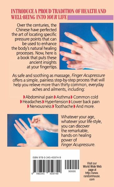Whatever your age, whatever your lifestyle, you can discover the remarkable, hands-on healing power of Finger Acupressure. Over the centuries, the Chinese have perfected the art of locating specific pressure points that can be used to enhance the body's natural healing processes. Now, here is a book that puts these ancient insights at your fingertips. As safe and soothing as massage, Finger Acupressure offers simple, painless step-by-step processes that will help you relieve more than thirty common, everyday aches and ailments, including abdominal pain, asthma, the common cold, headaches, hypertension, lower back pain, nervousness, toothache, and more.