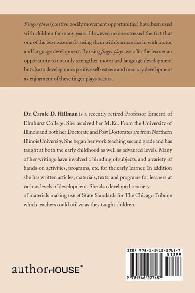 Finger plays (creative bodily movement opportunities) have been used with children for many years. However, no one stressed the fact that one of the best reasons for using them with learners ties in with motor and language development. By using finger plays, we offer the learner an opportunity to not only strengthen motor and language development but also to develop more positive self-esteem and memory development as enjoyment of these finger plays occurs.