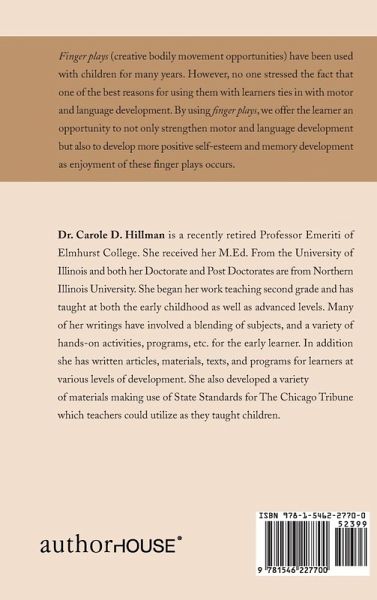 Finger plays (creative bodily movement opportunities) have been used with children for many years. However, no one stressed the fact that one of the best reasons for using them with learners ties in with motor and language development. By using finger plays, we offer the learner an opportunity to not only strengthen motor and language development but also to develop more positive self-esteem and memory development as enjoyment of these finger plays occurs.