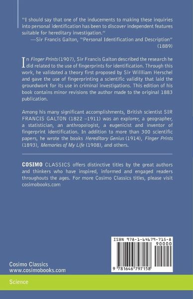 "I should say that one of the inducements to making these inquiries into personal identification has been to discover independent features suitable for hereditary investigation." -Sir Francis Galton, "Personal Identification and Description" (1889) In Finger Prints (1907), Sir Francis Galton described the research he did related to the use of fingerprints for identification. Through this work, he validated a theory first proposed by Sir Willliam Herschel and gave the use of fingerprinting a scientific validity that laid the groundwork for its use in criminal investigations. This edition of his book contains minor revisions the author made to the original 1883 publication.