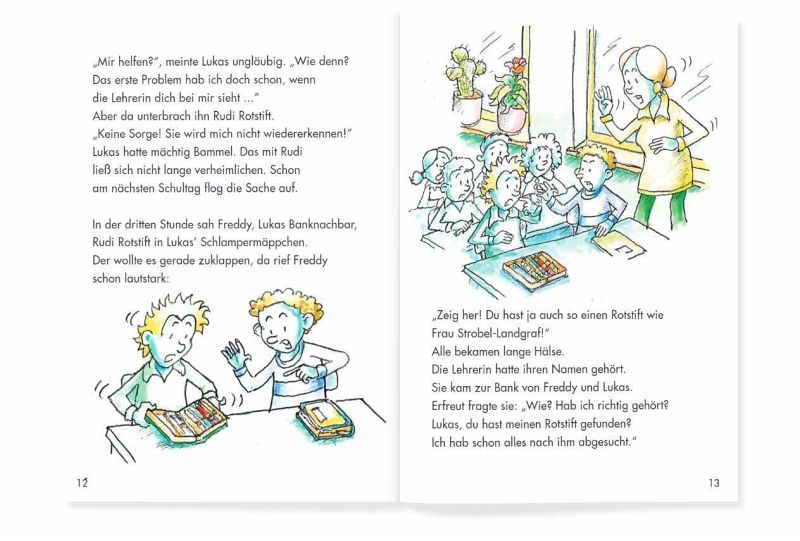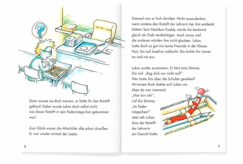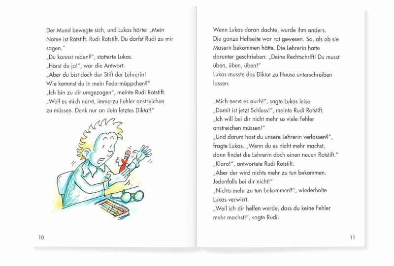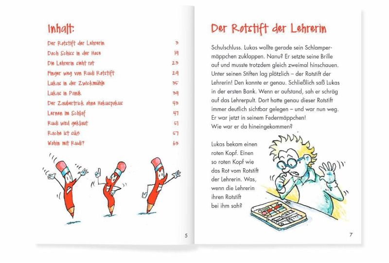 Der Rotstift der Lehrerin, der sprechen kann! Wie kam er zum schüchternen Lukas ins Federmäppchen? Tatsache ist, dass Lukas ab jetzt bessere Noten schreibt. Mehr noch: der Junge erlebt mit seinem Bleistift-Freund ab jetzt turbulente Zeiten.