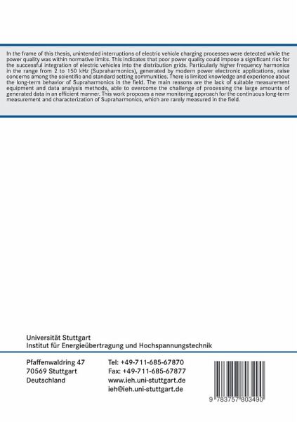 In the frame of this thesis, unintended interruptions of electric vehicle charging processes were detected while the power quality was within normative limits. This indicates that poor power quality could impose a significant risk for the successful integration of electric vehicles into the distribution grids. Particularly higher frequency harmonics in the range from 2 to 150 kHz (Supraharmonics), generated by modern power electronic applications, raise concerns among the scientific and standard setting communities. There is limited knowledge and experience about the long-term behavior of Supraharmonics in the field. The main reasons are the lack of suitable measurement equipment and data analysis methods, able to overcome the challenge of processing the large amounts of generated data in an efficient manner. This work proposes a new monitoring approach for the continuous long-term measurement and characterization of Supraharmonics, which are rarely measured in the field.