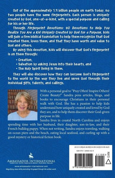 Out of the approximately 7.9 billion people on earth today, no two people have the same fingerprints. Each person is uniquely created by God, one-of-kind, with a special purpose and calling for his or her life. Through Fingerprint Devotions: 40 Devotions to Help You Realize You Are a Kid Uniquely Created by God for a Purpose, kids will gain a firm biblical foundation to help them recognize that God created them, loves them, and that they have worth and value to God and others. By using this devotion, kids will discover that God's fingerprint is on them through (a) creation, (b) through salvation by asking Jesus into their hearts and (c) through the Holy Spirit living in them. They will also discover how they can become God's fingerprint to the world by the way they live and serve God through their individual gifts, talents, and callings.