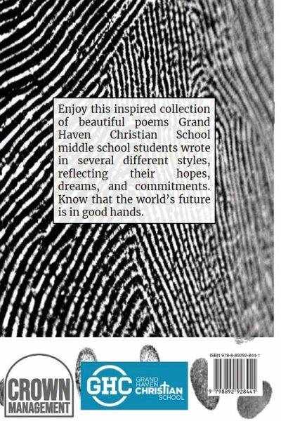 Enjoy this inspired collection of Grand Haven Christian School middle school student poems in several styles. Know that the world's future is in good hands with the likes of these students, as their hopes, dreams, and commitments clearly show.