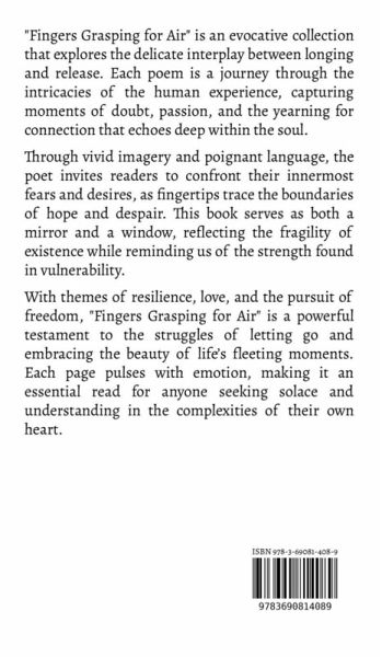 "Fingers Grasping for Air" is an evocative collection that explores the delicate interplay between longing and release. Each poem is a journey through the intricacies of the human experience, capturing moments of doubt, passion, and the yearning for connection that echoes deep within the soul. Through vivid imagery and poignant language, the poet invites readers to confront their innermost fears and desires, as fingertips trace the boundaries of hope and despair. This book serves as both a mirror and a window, reflecting the fragility of existence while reminding us of the strength found in vulnerability. With themes of resilience, love, and the pursuit of freedom, "Fingers Grasping for Air" is a powerful testament to the struggles of letting go and embracing the beauty of life's fleeting moments. Each page pulses with emotion, making it an essential read for anyone seeking solace and understanding in the complexities of their own heart.