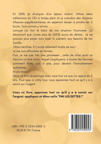 En 2010, je divorçais d'un époux violent. J'étais mère célibataire en CDI à temps plein et je cumulais des dizaines d'heures supplémentaires, en espérant réussir à joindre les 2 bouts. Sans jamais y arriver ! Lorsque j'ai fait le bilan de ma situation financière, j'ai découvert que j'avais plus de 12000 euros de dettes. J'étais terrifiée. Et j'avais tellement honte de moi ! Je me suis effondrée en larmes. Puis, je me suis fait une promesse : celle de m'en sortir et d'écrire un livre dans lequel j'expliquerai à toutes les femmes comment faire pas à pas, pour devenir financièrement autonome. Et j'ai réussi ! Dans ce livre, je partage avec vous tout ce que j'ai appris en 2 ans. Pour que, à votre tour, vous appreniez tout ce qu'il y a à savoir sur l'argent. Lisez ce livre, apprenez tout ce qu'il y a à savoir sur l'argent et dites enfin "FINI LES DETTES !"