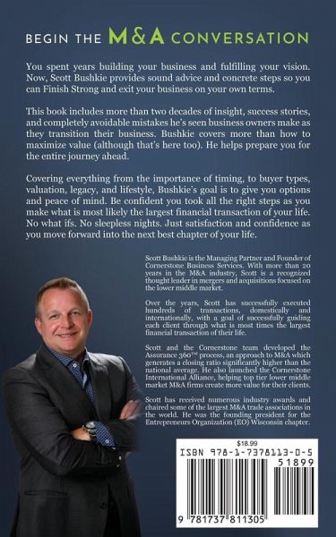 You spent years building your business and fulfilling your vision. Now, Scott Bushkie provides sound advice and concrete steps so you can Finish Strong and exit your business on your own terms. This book includes more than two decades of insight, success stories, and completely avoidable mistakes he's seen business owners make as they transition their business. Bushkie covers more than how to maximize value (although that's here too). He helps prepare you for the entire journey ahead. Covering everything from the importance of timing, to buyer types, valuation, legacy, and lifestyle, Bushkie's goal is to give you options and peace of mind. Be confident you took all the right steps as you make what is most likely the largest financial transaction of your life. No what ifs. No sleepless nights. Just satisfaction and confidence as you move forward into the next best chapter of your life.