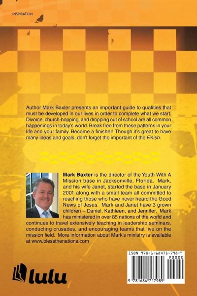 Author Mark Baxter presents an important guide to qualities that must be developed in our lives in order to complete what we start. Divorce, church-hopping, and dropping out of school are all common happenings in today's world. Break free from these patterns in your life and your family. Become a finisher! Though it's great to have many ideas and goals, don't forget the important of the Finish.